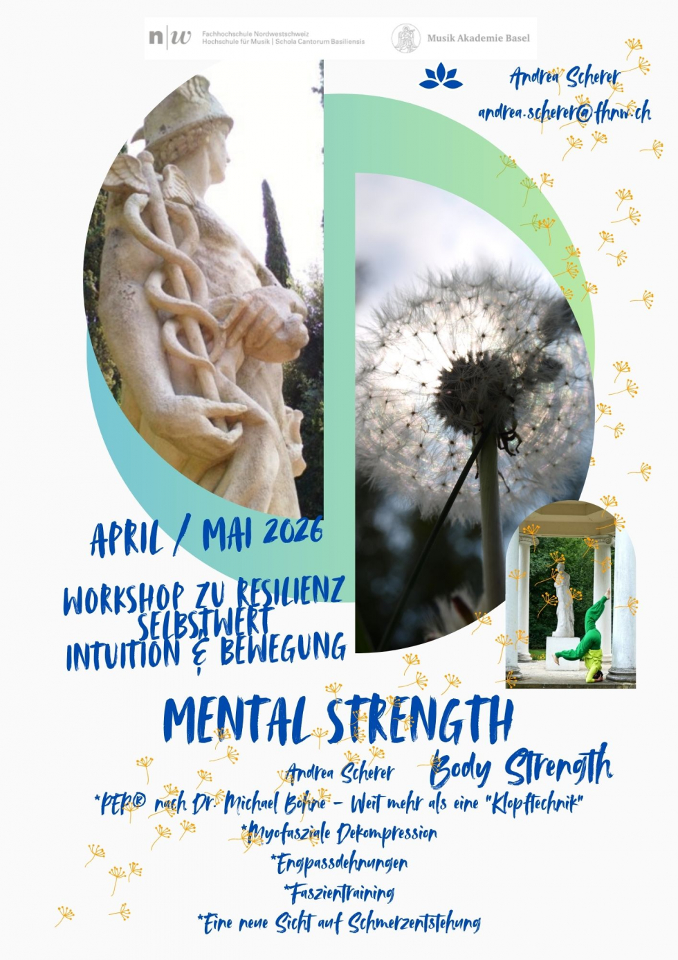 Wo: Samstag Vormittag: Studio Eckenstein, Musik-Akademie Basel, Leonhardsgraben 48, 4051 Basel (alte Schola), EG. Eingang über Haus 1, Eckensteinhof. Samstag Nachmittag: Tanz und Gymnastikstudio MOVIMENTO, Neuweilerstrasse 5, 4054 Basel Sonntag Vormittag: MOVIMENTO Sonntag Nachmittag (bei schönem Wetter): Garten von Andrea